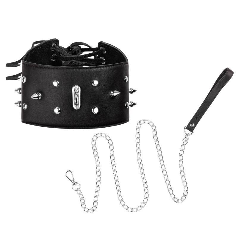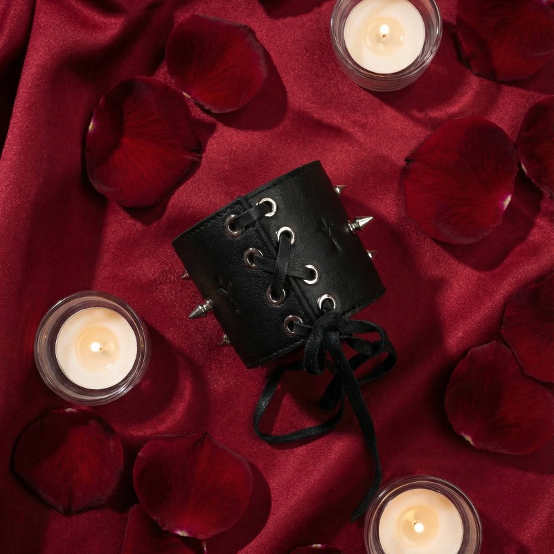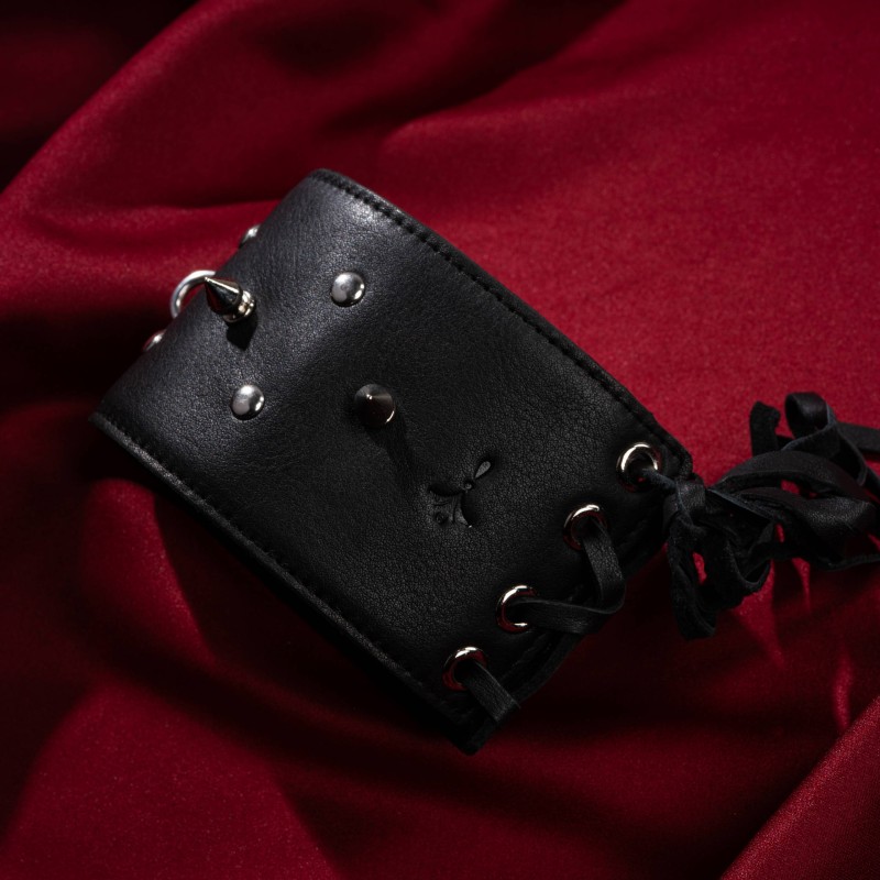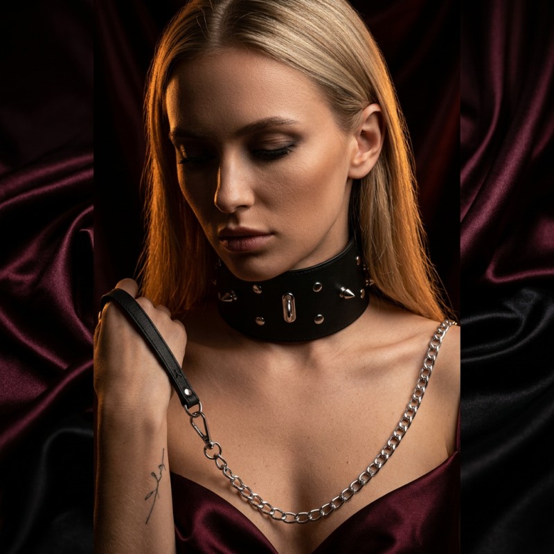 Szeroka obroża wykonana z naturalnej skóry premium miękko otula szyję, tworząc wyrazisty, zdecydowany akcent. Jej gładka powierzchnia oraz starannie wykończone detale podkreślają rzemieślniczą jakość i elegancki charakter. Metalowe ćwieki nadają jej surowości, jednocześnie wpisując się w estetykę luksusowego fetish designu.