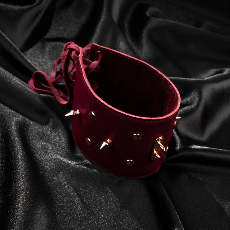 Szeroka obroża wykonana z naturalnej skóry premium miękko otula szyję, tworząc wyrazisty, zdecydowany akcent. Jej gładka powierzchnia oraz starannie wykończone detale podkreślają rzemieślniczą jakość i elegancki charakter. Metalowe ćwieki nadają jej surowości, jednocześnie wpisując się w estetykę luksusowego fetish designu.