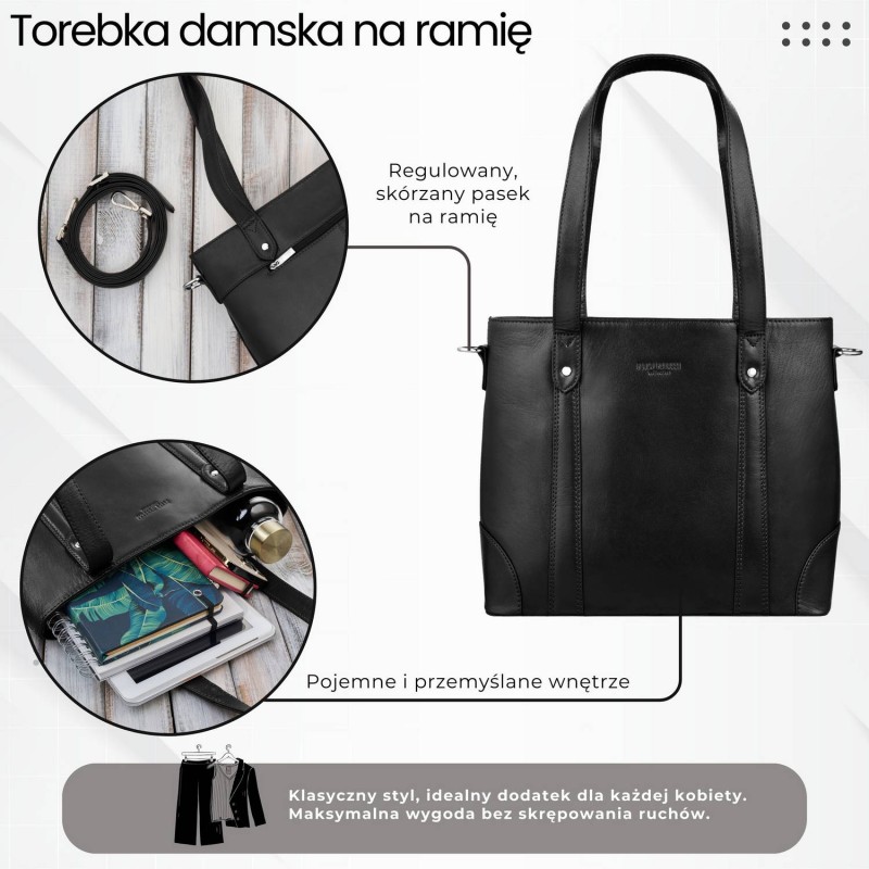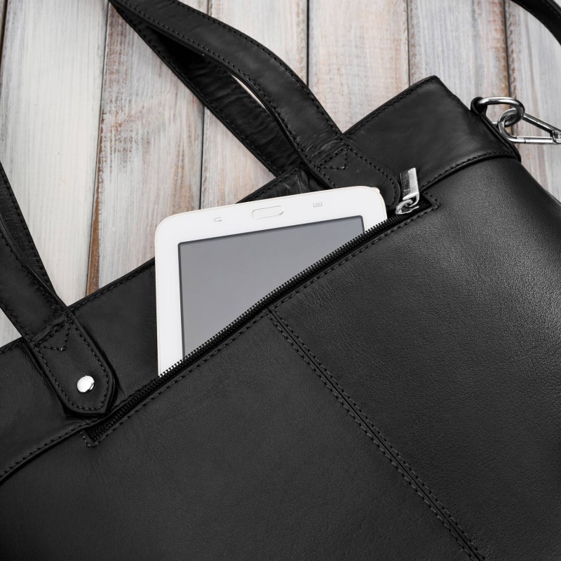 Единствена по рода си и уникална - с тези думи може да се опише чантата T-41 в черно. Защо? Естествената кожа в този модел е подложена на ръчно боядисване, което я прави уникална. Както подобава на чанта за пазаруване, вътрешността ѝ разполага с много място за съхранение. В основното отделение с цип се намират джоб с цип и отделение за телефона ви. Това гарантира, че няма да търсите най-необходимите си вещи на дъното на чантата. Допълнителен бонус е и джобът с цип на гърба. Свалящата се и регулируема каишка ви позволява удобно да преметнете чантата през рамо. Това е идеалната ежедневна чанта, която ще ви бъде от полза на път за работа, като удобна чанта за документи и др. Този модел дамска кожена чанта е и оригинална идея за подарък за вашата любима!