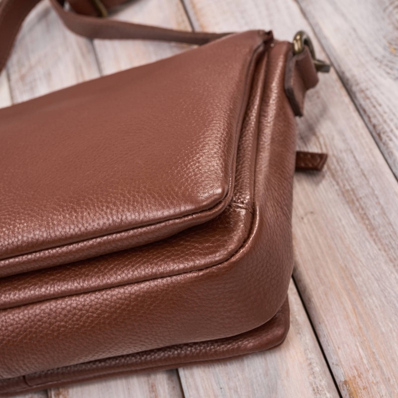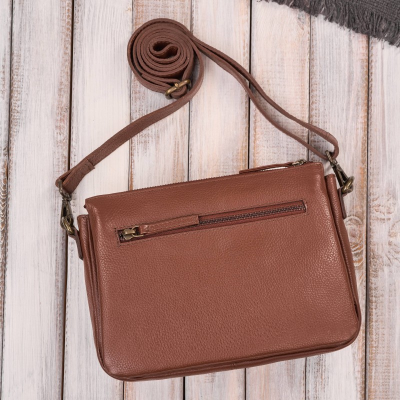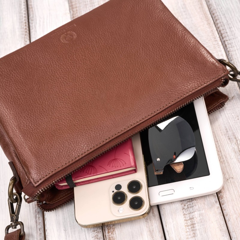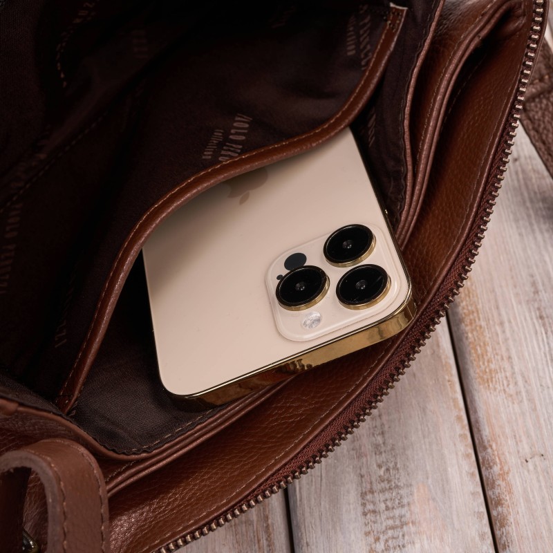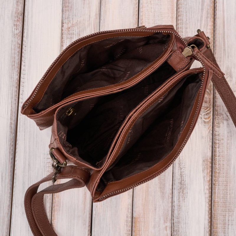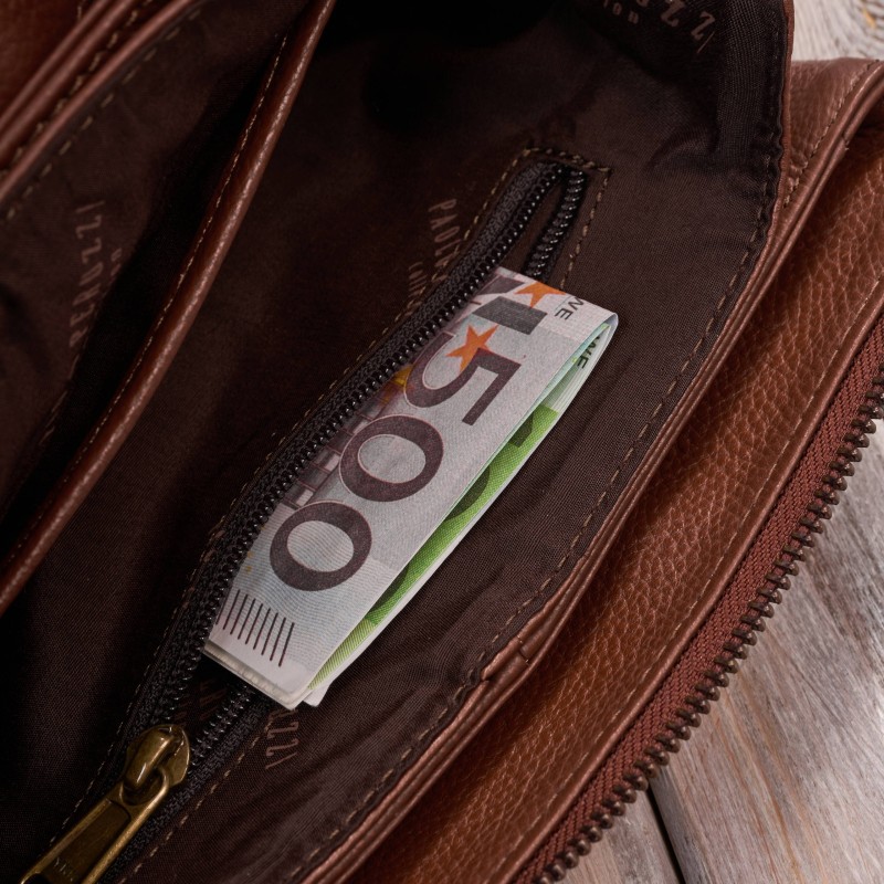 Дизайнерите на марката Paolo Peruzzi са съчетали компактния размер с голяма функционалност в тази чанта. Трите вместителни отделения, затворени със солидни метални ципове в златист цвят, създават пространство, в което лесно можете да поберете необходимите вещи - телефон, портфейл, ключове или козметика. Благодарение на интелигентния си дизайн чантата може да разширява обема си, когато се нуждаете от повече място.