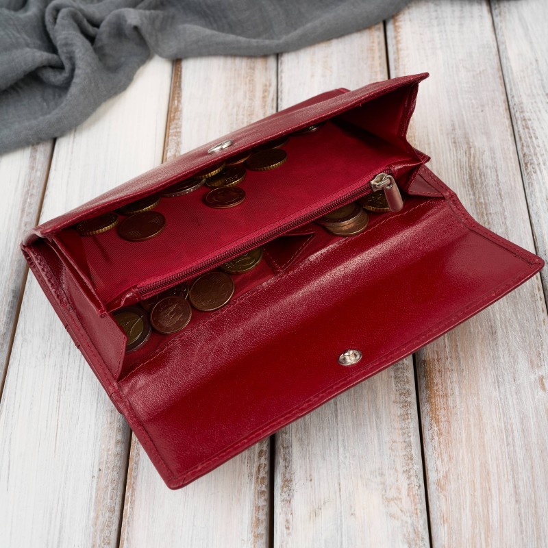 Големият дамски портфейл от червена кожа Paolo Peruzzi T-134-RD се основава на изпитан, здрав дизайн с вместителна вътрешност и класическо хоризонтално разпределение на отделенията. Наситено червеният цвят на пълнозърнестата кожа му придава уникален характер и го превръща в стилен акцент както за ежедневието, така и за елегантния стил.