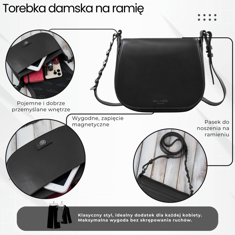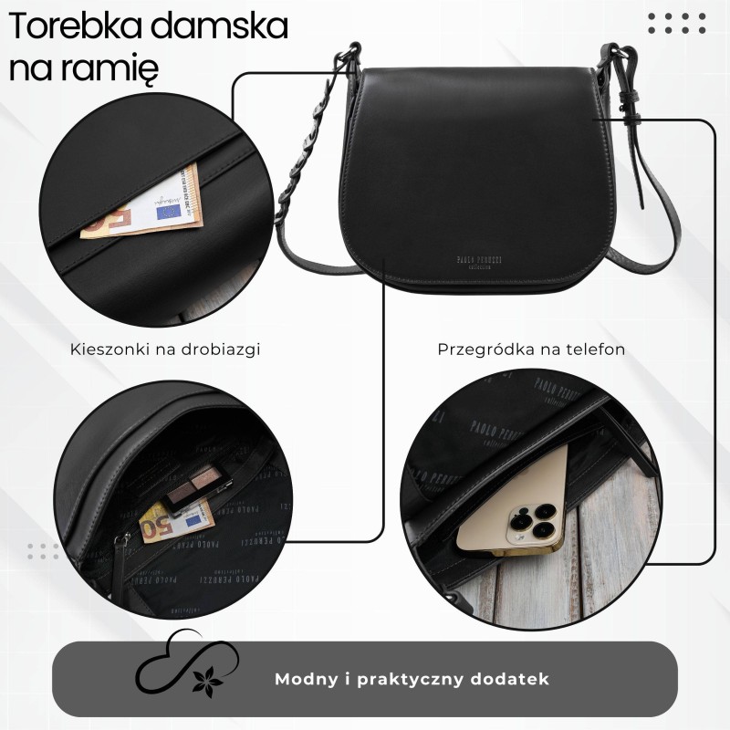 Търсите ли аксесоар, който съчетава удобството при употреба с модерен дизайн? Дамската кожена чанта Paolo Peruzzi KV-06-BL е модел, създаден за жени, които ценят изискания стил, качеството и непреходната естетика. Изработена от висококачествена естествена кожа в класически черен цвят, тя радва с финия си, елегантен характер - идеална както за ежедневни, градски стайлинги, така и за по-елегантни комбинации.