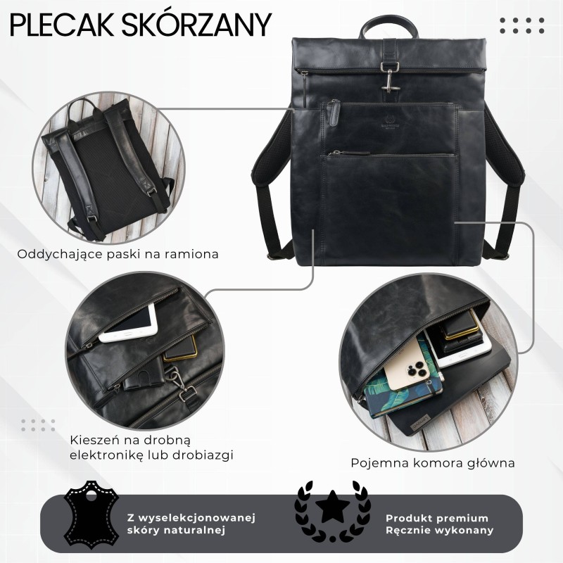 Класиката среща модерното. Раницата Paolo Peruzzi SL-02 е комбинация от висококачествена естествена кожа, елегантен ретро дизайн и практичност, която съвременните потребители очакват. Черната кожа, сребристият метален обков и отличителният рол топ дизайн създават една непреходна кожена раница, идеална за ежедневни задачи, работа, град или пътуване.