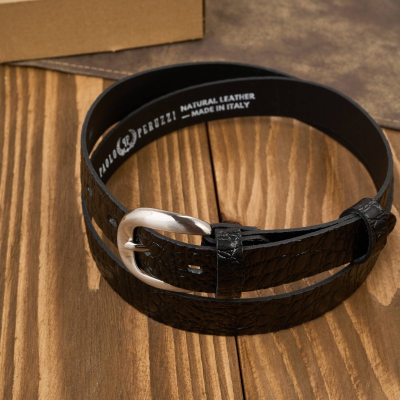 Tento model dámského pásku je návrhem pro ženy, které si rády hrají s módou! Opasek byl vyroben z odolné přírodní kůže s viditelným reliéfem imitujícím krokodýlí kůži. Je to skvělý návrh pro ženy, které rády vynikají a zdůrazňují svůj styling originálními koženými doplňky.