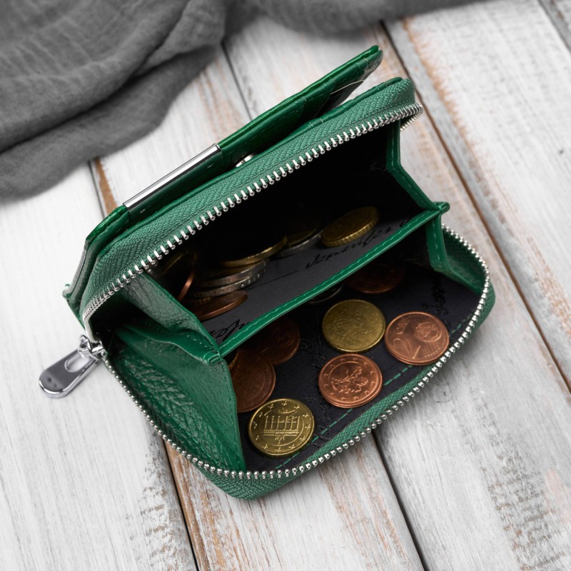 Seznamte se s modelem SP-18-CGRN - malou lakovanou dámskou peněženkou z přírodní kůže s výrazným reliéfem krokodýla. Tento jedinečný model v sobě spojuje moderní styl, eleganci a funkčnost, přičemž si zachovává kompaktní tvar, který se vejde do každé kabelky.