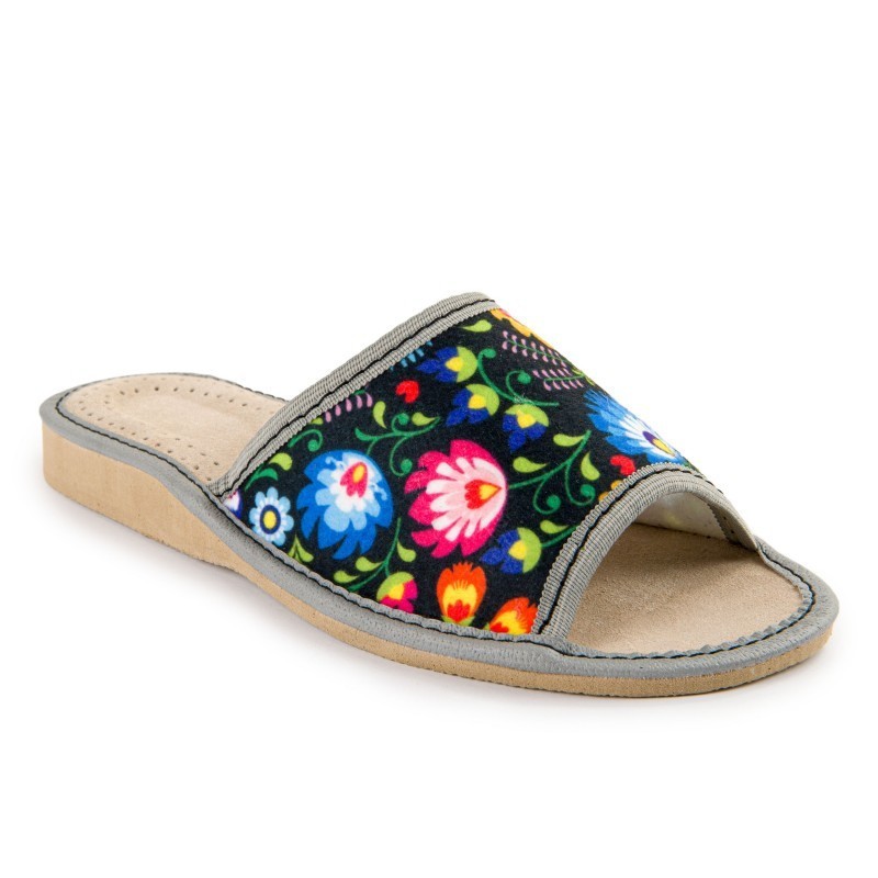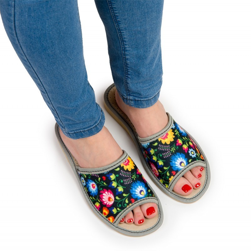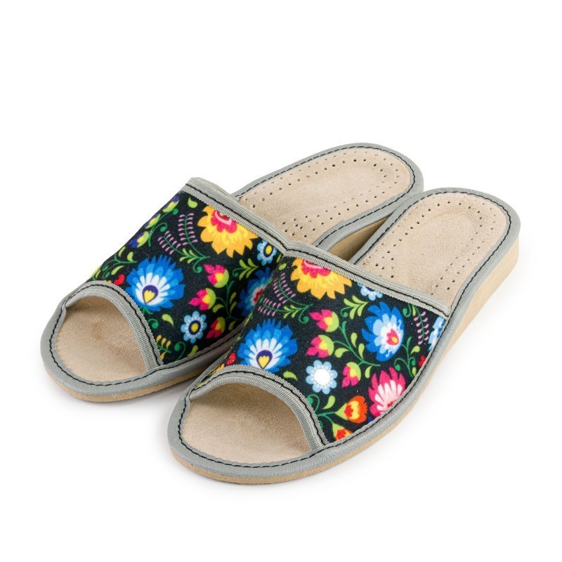 Pohodlné domácí pantofle v lidovém stylu s barevným květinovým potiskem. Jsou vyrobeny z prodyšné plsti s měkkou stélkou z přírodní kůže - zaručují pohodlí, trvanlivost a atraktivní vzhled. Lehká gumová podrážka EVA zajišťuje stabilitu a flexibilitu.