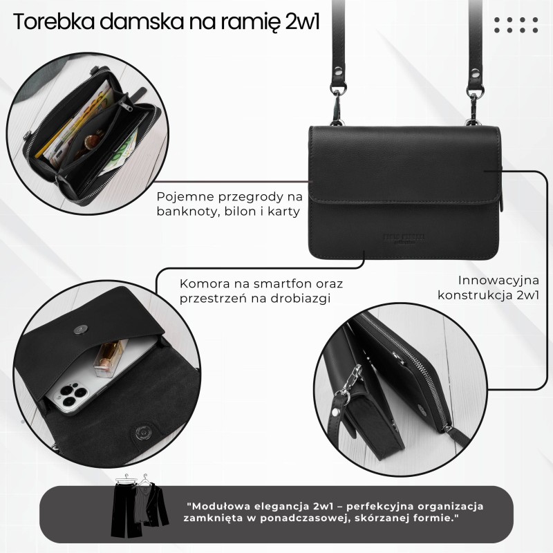 Kabelka AY-21-BL značky Paolo Peruzzi je moderní odpovědí pro ženy, které si cení flexibility, pořádku a stylu. Tato dámská kožená kabelka byla navržena jako modulární model 2 v 1, který můžete nosit přesně tak, jak chcete - dohromady nebo samostatně.