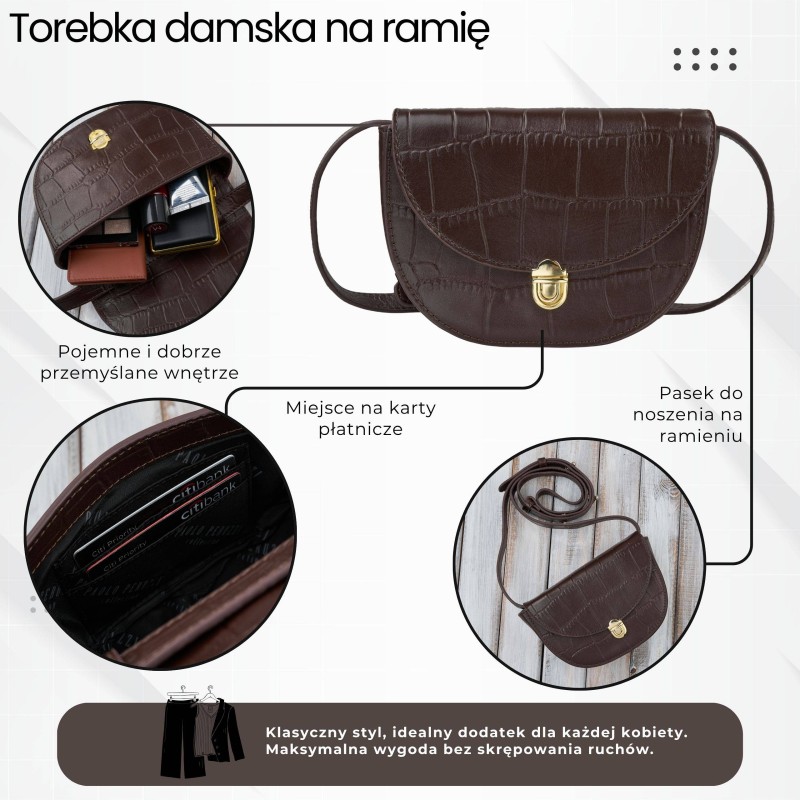 Hledáte doplněk, který podtrhne jedinečnost vašeho večerního stylingu a zároveň poskytne praktické řešení? Malá dámská kožená kabelka KV-01-BR byla vytvořena právě pro ženy, které očekávají maximální funkčnost uzavřenou v luxusní podobě. Je vyrobena z vysoce kvalitní přírodní kůže s reliéfem croco, v elegantním hnědém odstínu a se zlatým kováním, upoutá pozornost a dodá noblesu každému vzhledu.