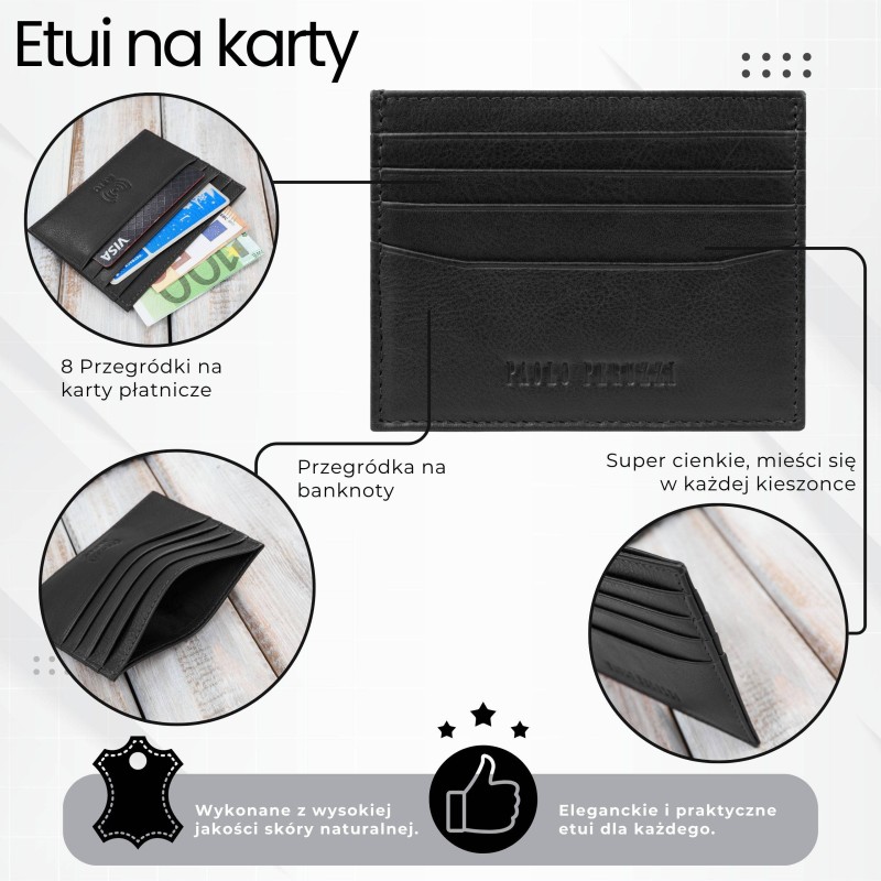 • Minimalistický design v klasické černé barvě - nadčasová barva se hodí ke každé stylizaci a dělá z pouzdra na karty nenápadný, ale stylový doplněk.