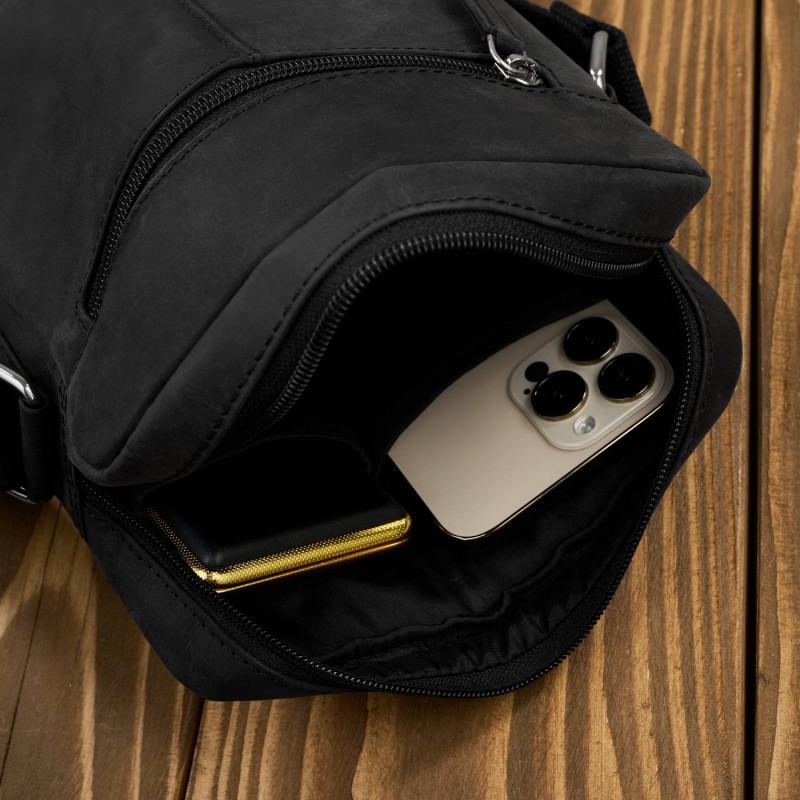 Hlavní přihrádka se zapíná na zip. Uvnitř je výsuvná kapsa určená na telefon (5x10 cm), druhá kapsa na drobnosti (10x10 cm) a na opačné straně větší kapsa na zip (15x15 cm).