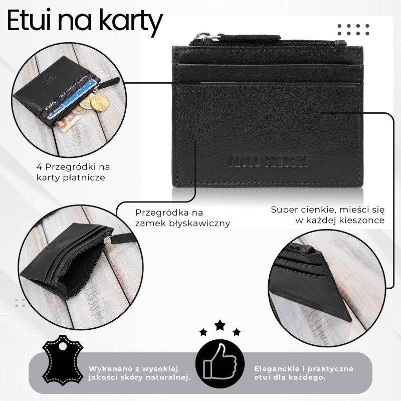 Paolo Peruzzi AY-17 card case is a combination of functionality, elegance and simplicity. Thanks to its manufacturing from natural grain leather, the product is characterized by high durability and resistance to everyday use. Classic black emphasizes the timeless character of the case, making it a universal addition to any styling - from business to casual.