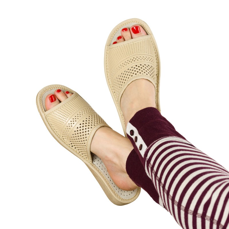 Opt for comfort and classic style - women's house flip-flops model KD-07-BG are the perfect choice for everyday wear. Made of organic leather with a soft natural leather insole. The lightweight, flexible EVA sole provides everyday comfort. The openwork pattern makes them lightweight and allows your feet to breathe, while the soft natural leather insole makes them more comfortable to wear. Comfortable and airy women's slippers ideal for home, balcony or terrace.