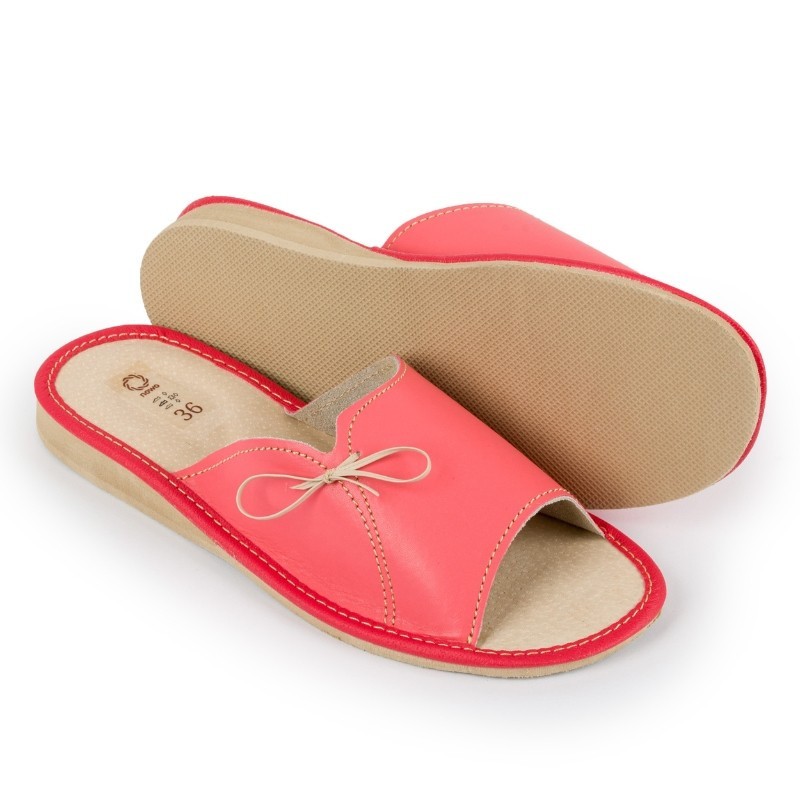 Bring a touch of color and comfort into your home with the KD-10-PI women's slippers. Their elegant open cut in a beautiful shade of red-pink perfectly combines feminine style with everyday functionality. The upper is made of high-quality synthetic leather, which is easy to care for and resistant to deformation. A subtle bow on the front adds to the overall appeal, creating an aesthetically pleasing and modern look. The interior of the slippers is padded with soft material, which ensures comfort all day long. The molded leather insole takes care of the comfort of the foot, and the slightly raised sole gives the silhouette lightness and cushions the steps well.