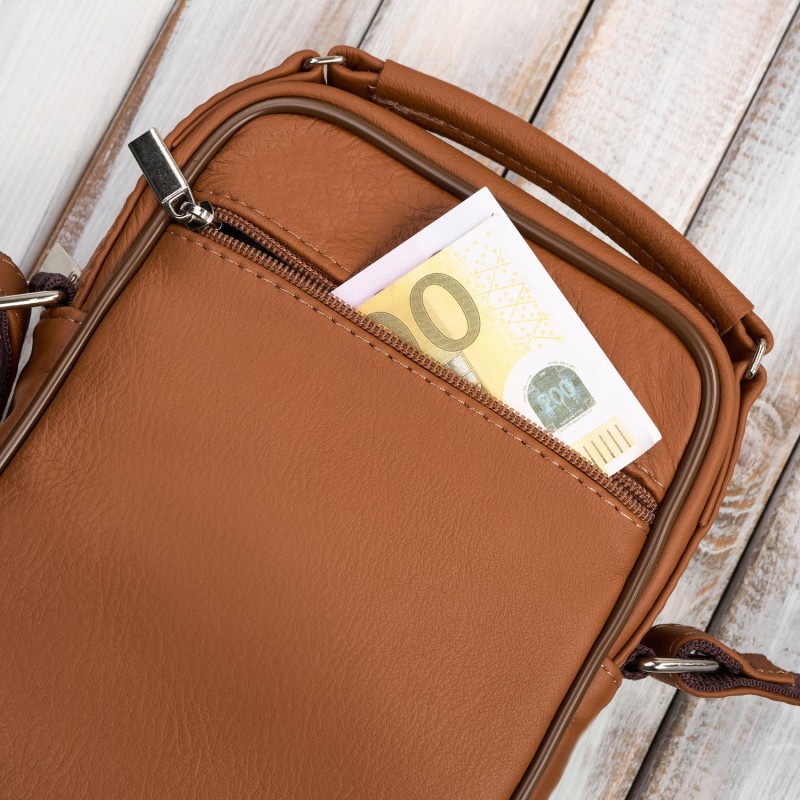 The Abruzzo men's sachet is made of natural leather. On the front there is a capacious pocket for the most frequently pulled items such as a phone or glasses. The bestselling model of the sachet was equipped, with another horizontally zipped pocket on the front. The spacious main compartment, which is lined with black lining, is zippered. On the back of the sachet there is another zippered pocket. The sachet looks elegant and stylish. The shoulder strap is made of a combination of nylon webbing and natural leather. This combination guarantees durable, many years of trouble-free use. Do not hesitate a moment longer and see for yourself that classics never go out of fashion!