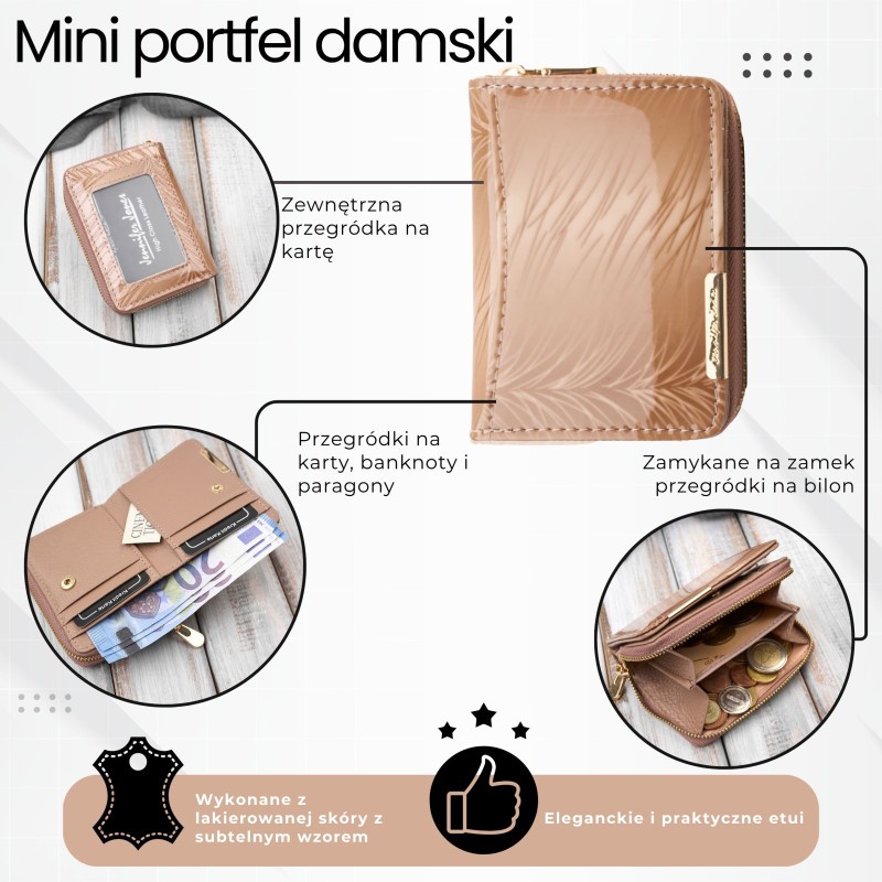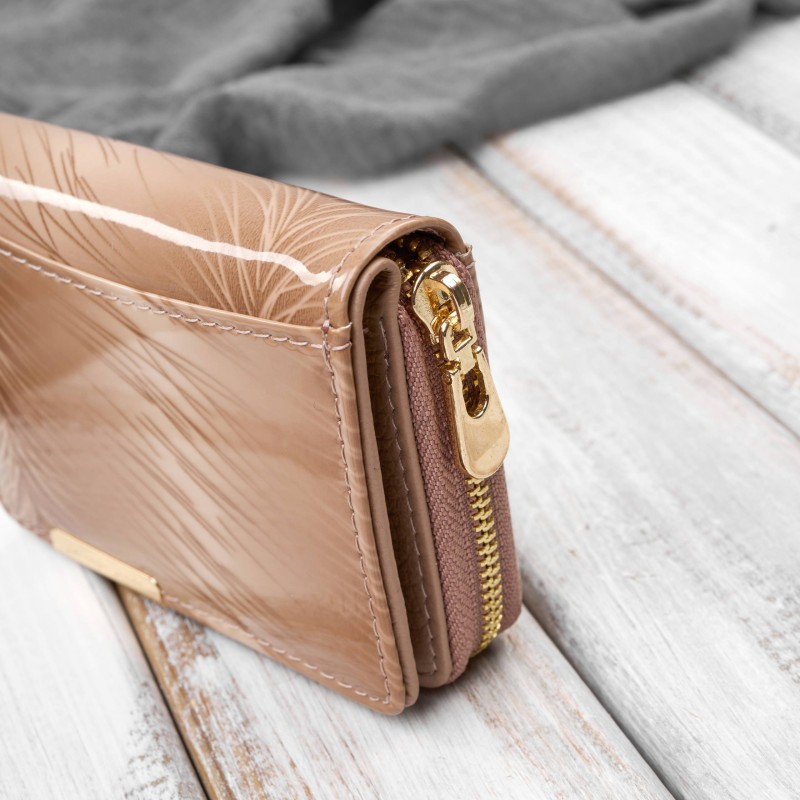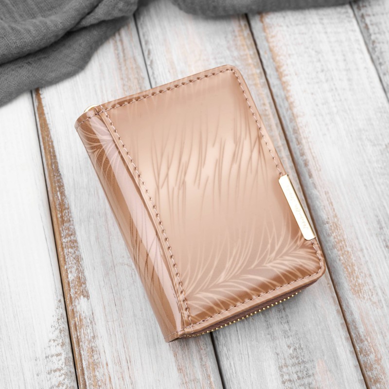 Meet the unique SP-18-RZBG ladies' wallet - a small yet charming accessory that combines classic form, delicate beige color and feminine floral motif. Made of natural patent leather, it impresses with its shine, durability and unique design. It is an ideal choice for women who appreciate subtle style and elegance in a compact form.