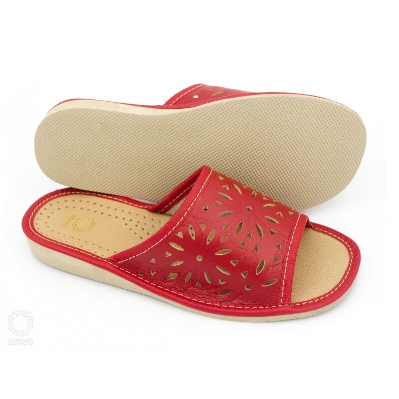 Wygoda i elegancja w domowym wydaniu! Te damskie kapcie w kolorze intensywnej czerwieni to połączenie funkcjonalności i stylu. Wierzch wykonany z wysokiej jakości, perforowanej skóry syntetycznej z ozdobnym ażurowym wzorem zapewnia odpowiednią cyrkulację powietrza, chroniąc stopę przed przegrzaniem. Miękka, profilowana wkładka z drobną perforacją dba o komfort użytkowania nawet przez cały dzień. Kapcie posiadają lekką, antypoślizgową podeszwę, która zapewnia stabilność na różnych powierzchniach, a staranne przeszycia podkreślają ich solidne wykonanie.