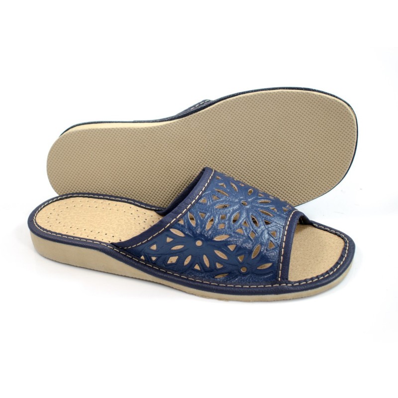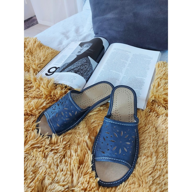 Wygoda i elegancja w domowym wydaniu! Te damskie kapcie w kolorze intensywnego granatu to połączenie funkcjonalności i stylu. Wierzch wykonany z wysokiej jakości, perforowanej skóry syntetycznej z ozdobnym ażurowym wzorem zapewnia odpowiednią cyrkulację powietrza, chroniąc stopę przed przegrzaniem. Miękka, profilowana wkładka z drobną perforacją dba o komfort użytkowania nawet przez cały dzień. Kapcie posiadają lekką, antypoślizgową podeszwę, która zapewnia stabilność na różnych powierzchniach, a staranne przeszycia podkreślają ich solidne wykonanie.