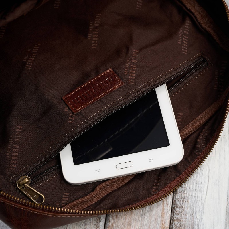 Komfort noszenia zapewnia tylny panel z oddychającego materiału oraz szelki od wewnętrznej strony wzmocnione bawełnianym canvasem – dzięki temu plecak łączy w sobie solidność z wygodą. Dodatkowym atutem jest praktyczny uchwyt do ręki, który zwiększa funkcjonalność podczas codziennego użytkowania. Wnętrze obszyto brązową podszewką z logo Paolo Peruzzi, podkreślając luksusowy charakter plecaka.