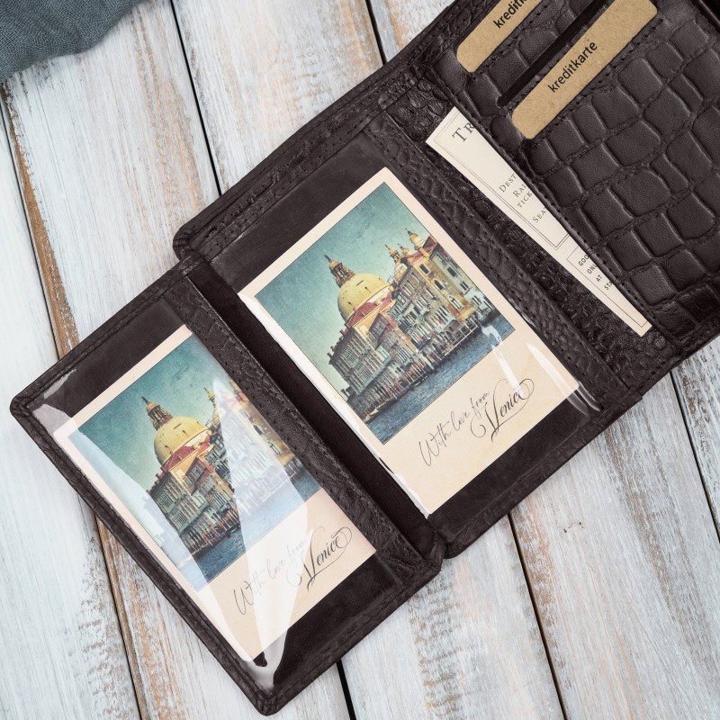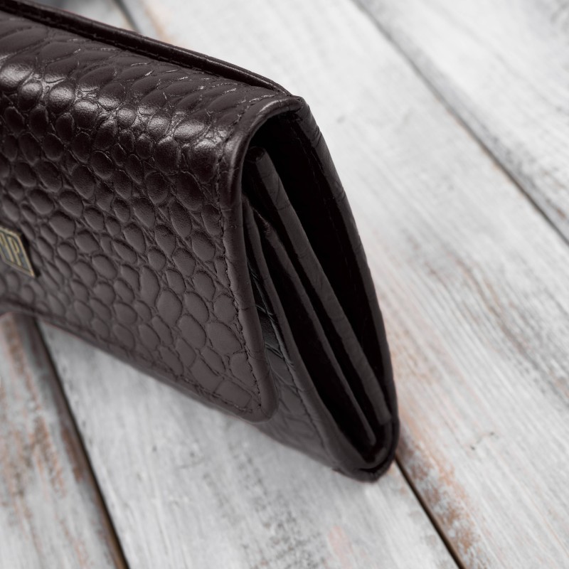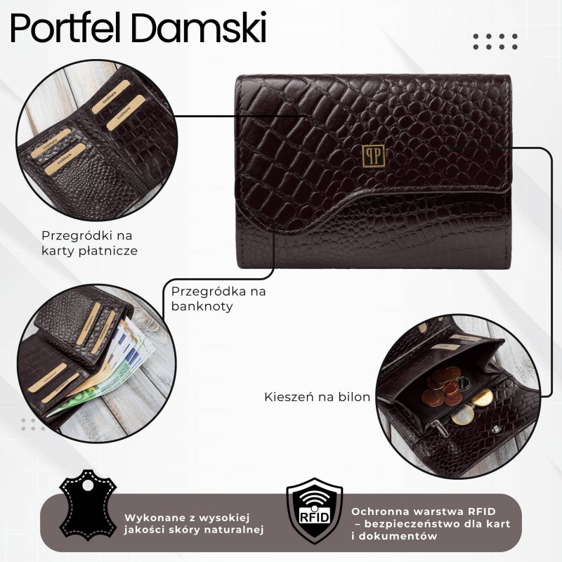 Małe portfele damskie Paolo Peruzzi to połączenie funkcjonalności i ponadczasowej elegancji. Model T-135-BR został wykonany z wysokogatunkowej, naturalnej skóry tłoczonej w motywie croco. Naturalny odcień brązu nadaje całości szlachetności i subtelnej elegancji. Uwagę zwraca także metalowe logo marki w kolorze czarno-złotym, które w elegancki sposób przełamuje strukturę skóry i dodaje całości luksusowego wykończenia.