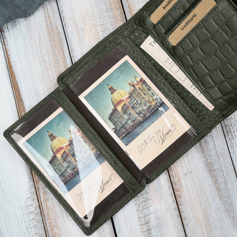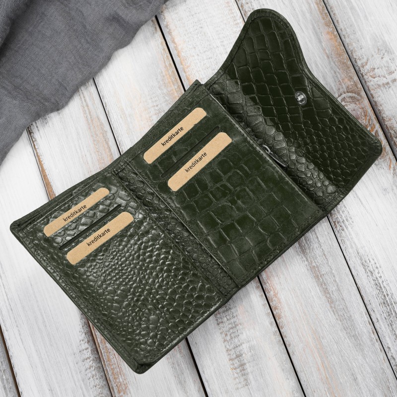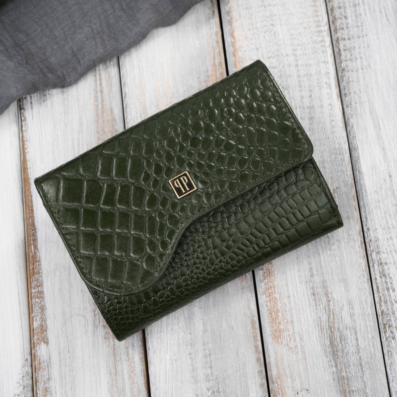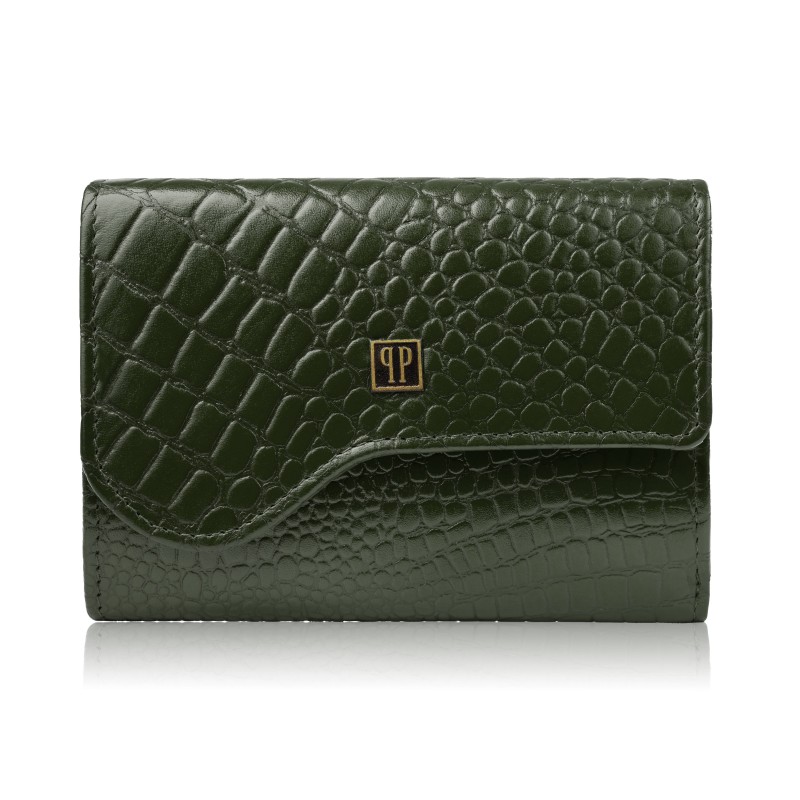 Małe portfele damskie Paolo Peruzzi to połączenie funkcjonalności i ponadczasowej elegancji. Model T-135-GR został wykonany z wysokogatunkowej, naturalnej skóry tłoczonej w motywie croco. Naturalny odcień zieleni nadaje całości szlachetności i subtelnej elegancji. Uwagę zwraca także metalowe logo marki w kolorze czarno-złotym, które w elegancki sposób przełamuje strukturę skóry i dodaje całości luksusowego wykończenia.