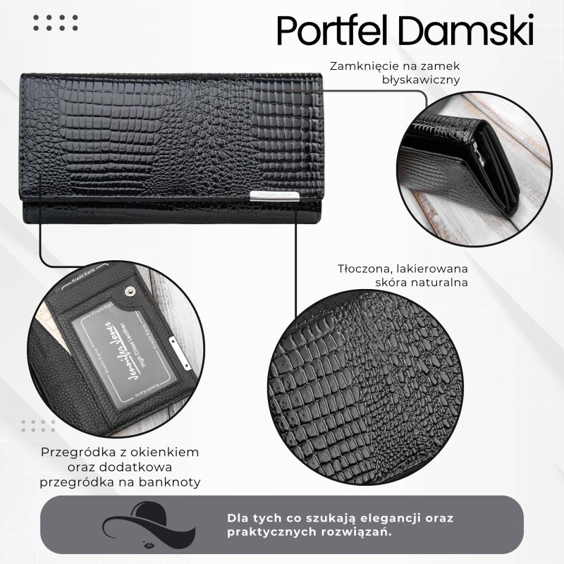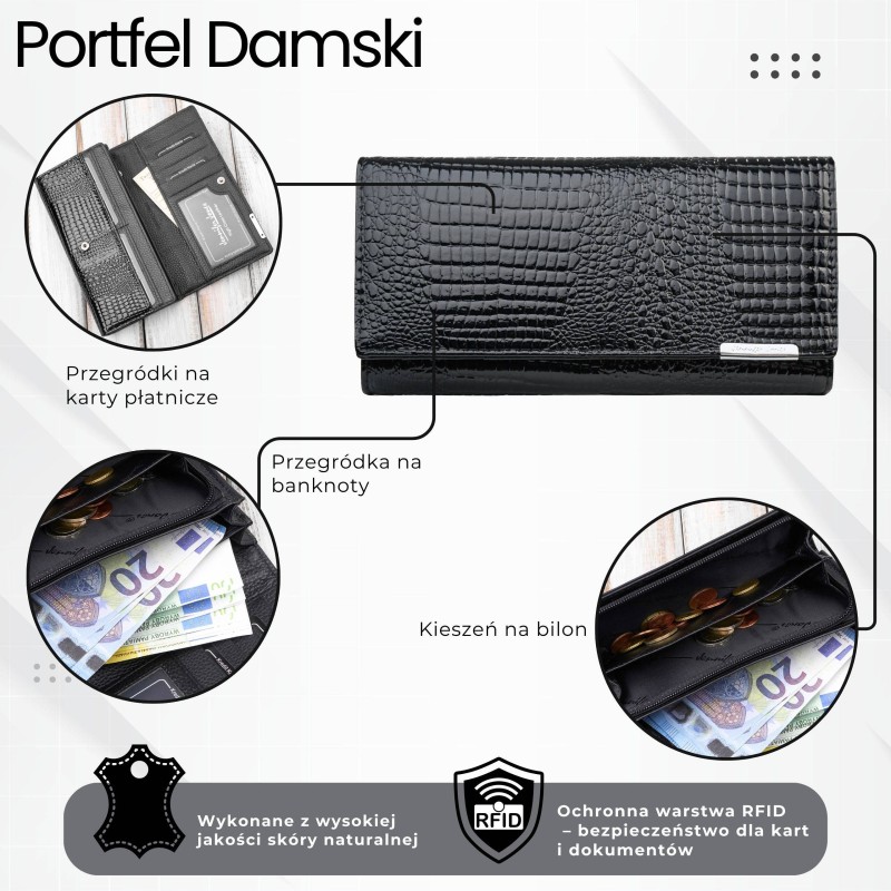 Poznaj wyjątkowy model SP-16-CBL – luksusowy, skórzany portfel damski z tłoczeniem w stylu croco, wykonany z najwyższej jakości lakierowanej skóry naturalnej. To propozycja dla kobiet, które pragną połączyć elegancję, trwałość i ponadczasowy szyk w jednym dodatku.