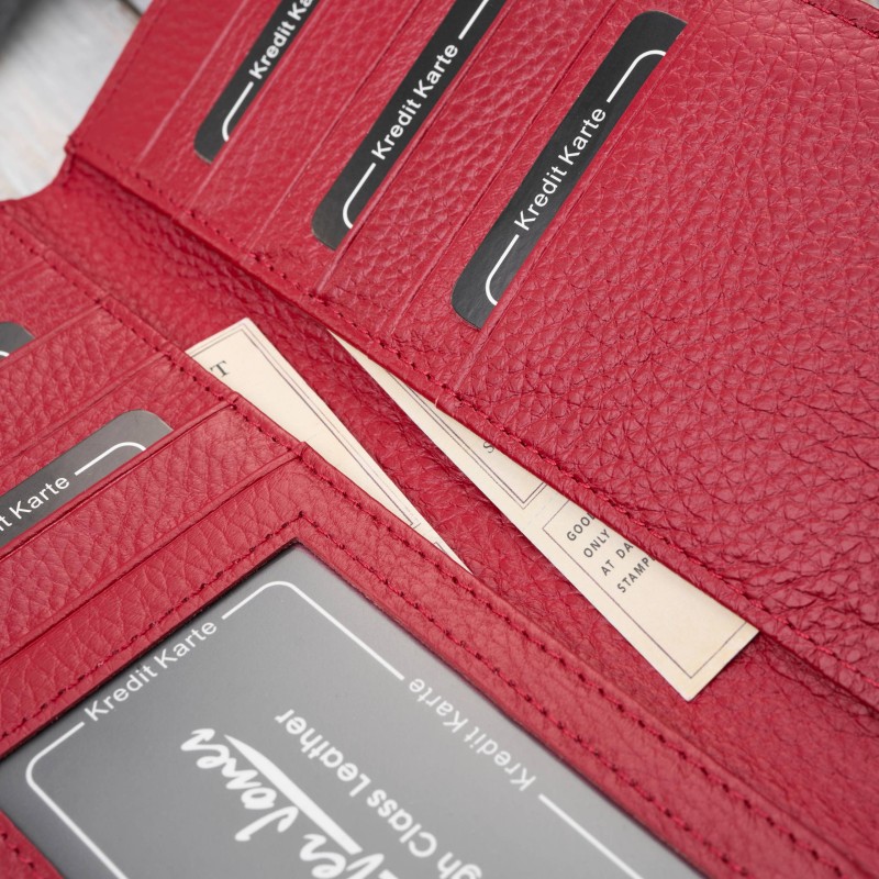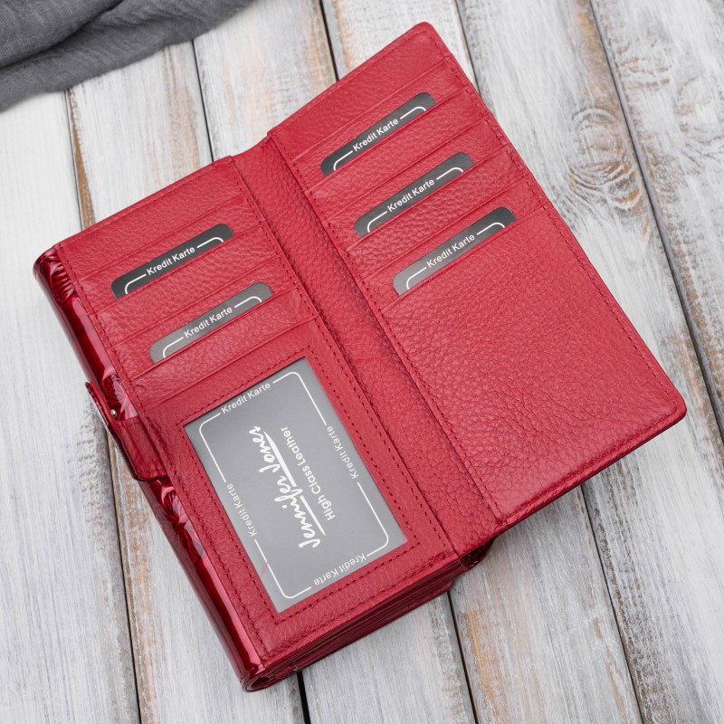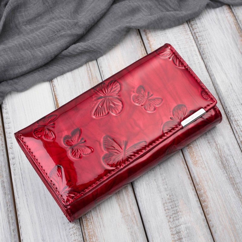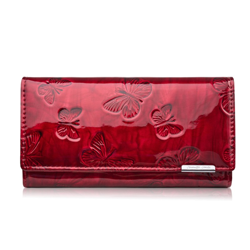 Zewnętrzna warstwa portfela to błyszcząca tafla lakieru, ozdobiona subtelnym tłoczeniem w motyle, które nadaje mu wyjątkowego uroku i delikatności. Głęboki czerwony kolor w połączeniu z srebrnymi okuciami sprawia, że model SP-19-GRN jest idealnym dodatkiem zarówno do klasycznych, jak i nowoczesnych stylizacji.