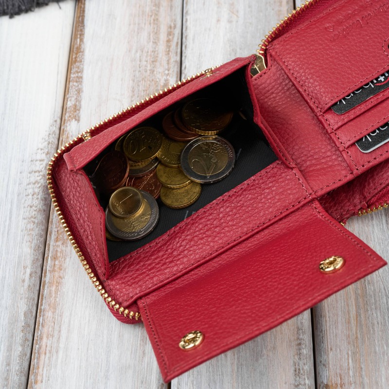 Szukasz eleganckiego, kompaktowego dodatku, który zmieści się w każdej damskiej torebce? Portfel damski skórzany KV-04 to model stworzony z myślą o kobietach ceniących wygodę, minimalizm i bezpieczeństwo. Wykonany z wysokiej jakości skóry naturalnej, wyróżnia się intensywnym, stylowym odcieniem oraz złotymi okuciami, które dodają mu szyku.