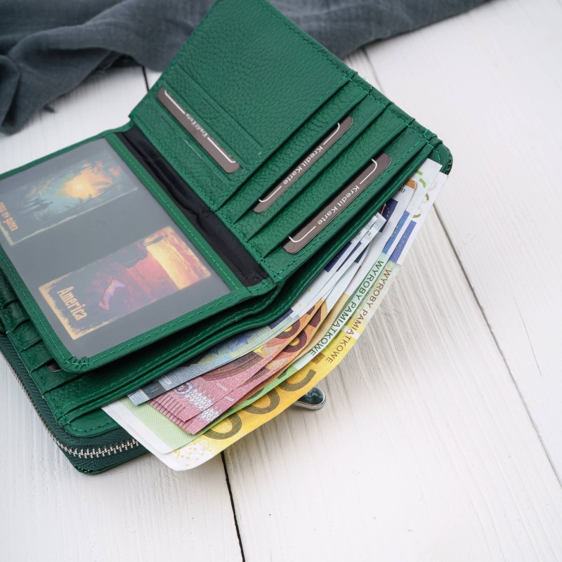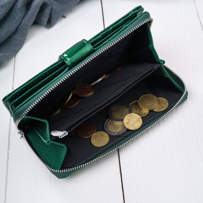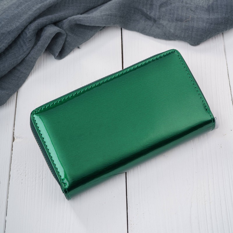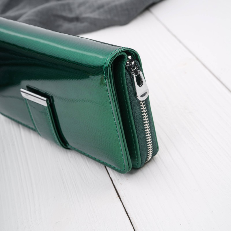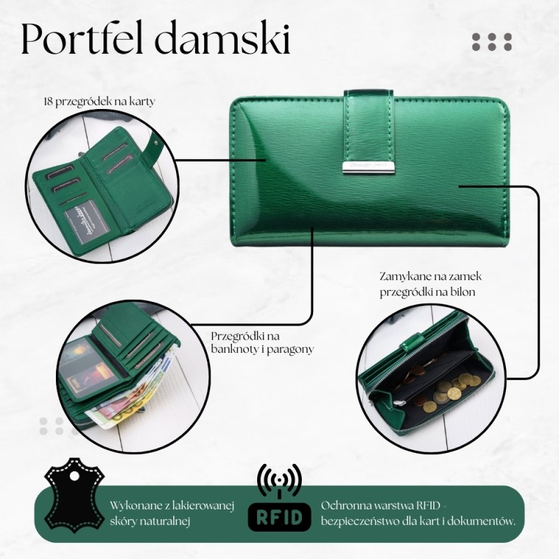 Ten portfel damski skórzany to propozycja dla kobiet, które chcą wyróżnić się dodatkiem o intensywnym charakterze. Lakierowana powierzchnia tworzy efekt gładkiej, lśniącej tafli, która pięknie odbija światło i podkreśla głębię zieleni – kojarzącej się z energią, świeżością i pewnością siebie.