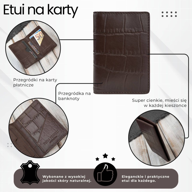 Eleganță modernă cu o atingere luxoasă. Geanta pentru carduri Paolo Peruzzi KV-05-CBR combină funcționalitatea minimalistă cu un design distinctiv inspirat de textura pielii de crocodil(croco). Fabricată din piele naturală de înaltă calitate, aceasta impresionează prin durabilitate și finisajul maro atemporal, care se potrivește perfect cu stilul celor care apreciază șic și profesionalismul.