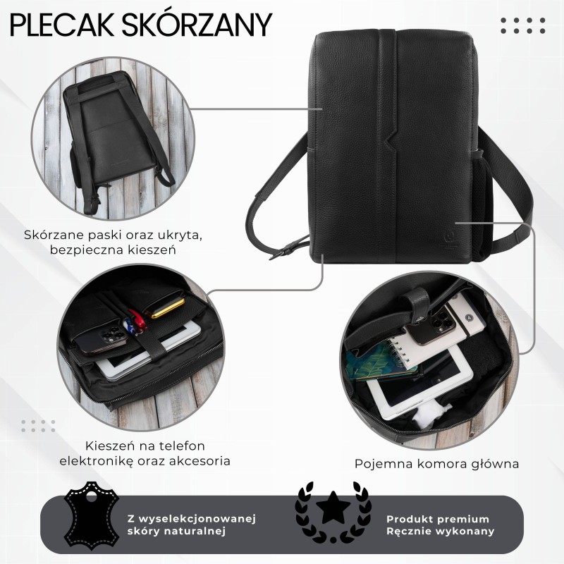 Plecak skórzany miejski do pracy premium kompaktowy czarny Paolo Peruzzi T-144-BL
