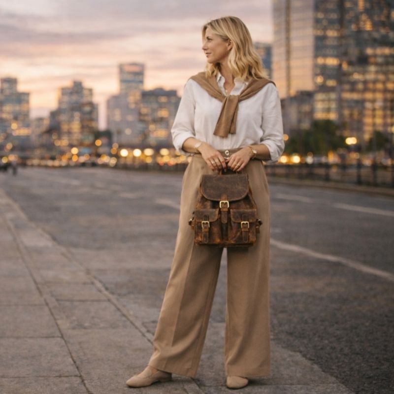 Compartiment principal spațios, în interiorul căruia există un buzunar cu fermoar și un compartiment pentru telefon. Compartimentul principal este prins cu o curea din piele și o clapetă cu magnet. Pe partea din față există două buzunare fixate, de asemenea, cu magneți.