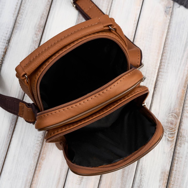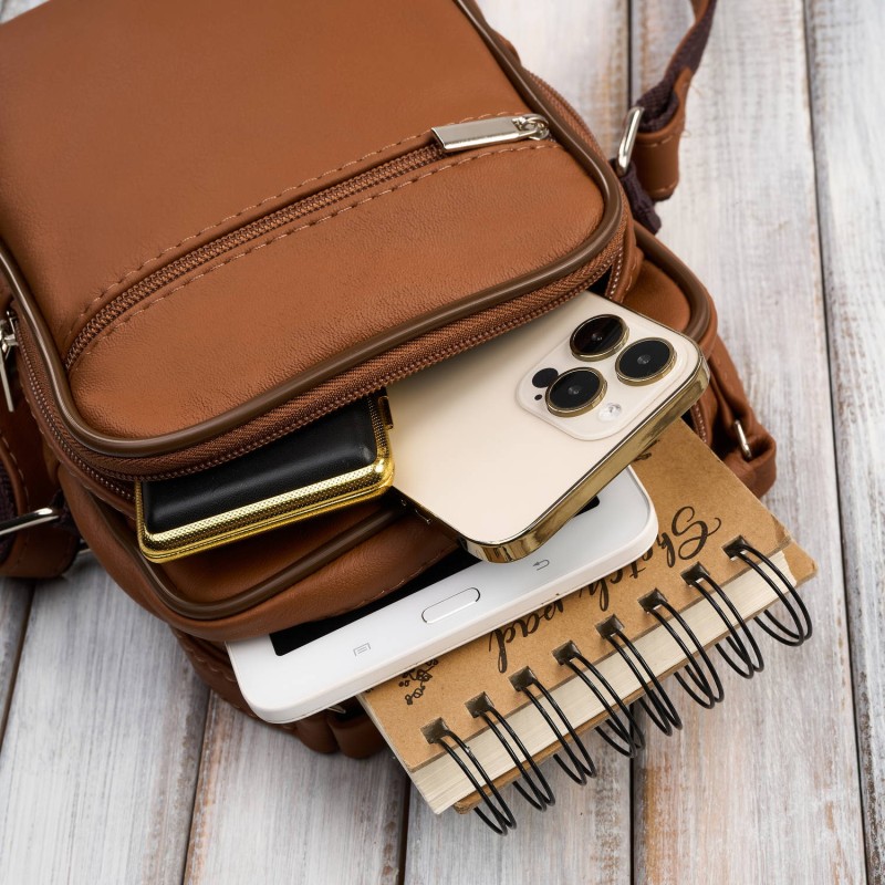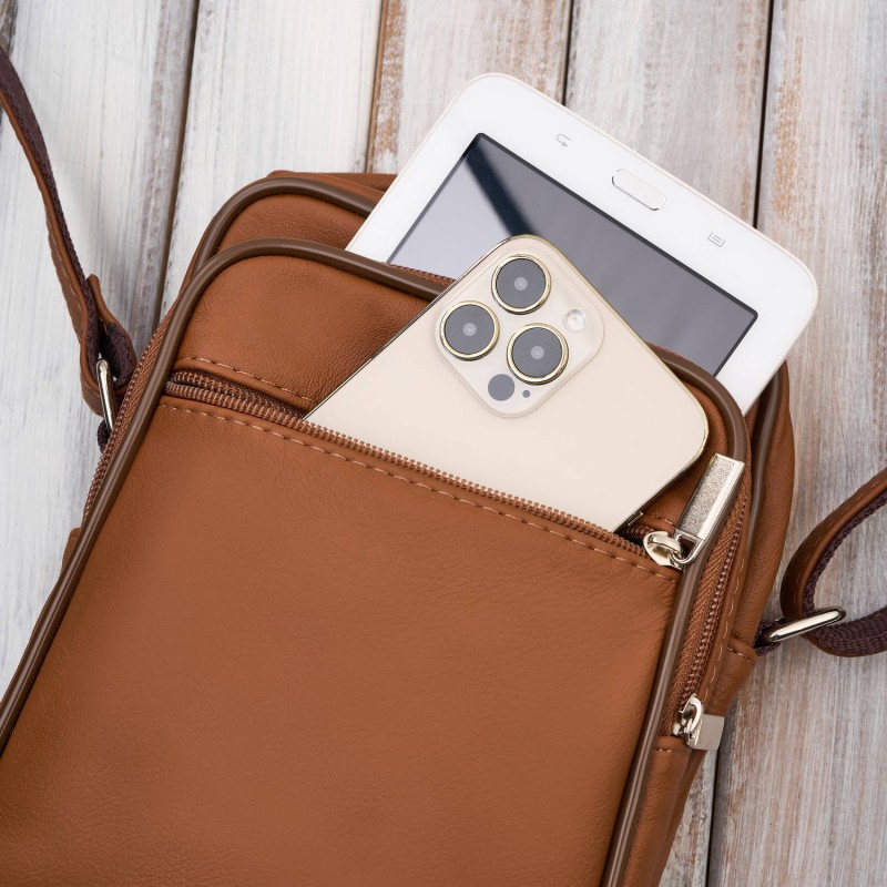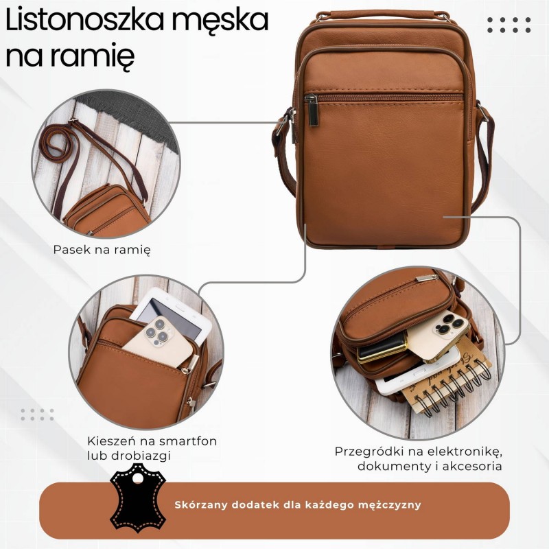 Wykonana z wysokogatunkowej naturalnej skóry w pięknym, koniakowym odcieniu, saszetka prezentuje się stylowo i ponadczasowo. Na froncie znajdują się aż dwie kieszenie – jedna pojemna, idealna na telefon czy okulary, oraz dodatkowa, pozioma kieszonka zapinana na suwak. Obszerna komora główna wykończona została czarną podszewką i zabezpieczona solidnym zamkiem błyskawicznym. Z tyłu saszetki umieszczono kolejną praktyczną kieszeń na suwak – idealną na dokumenty lub inne drobiazgi.