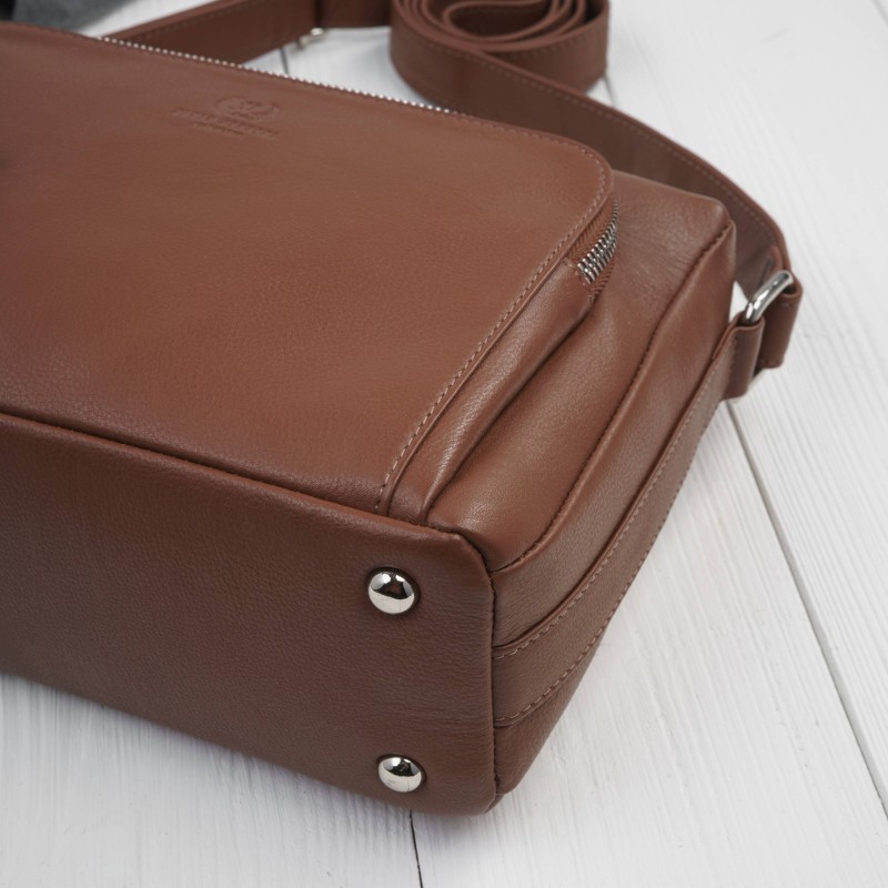 Koniakową torebkę wyróżniają srebrne okucia, które subtelnie rozświetlają całość i dodają nowoczesnego charakteru, podkreślając jednocześnie wysoką jakość wykonania. Przemyślana konstrukcja oraz pojemne wnętrze sprawiają, że torebka doskonale sprawdzi się na co dzień – do pracy, na spotkania lub spacery po mieście.