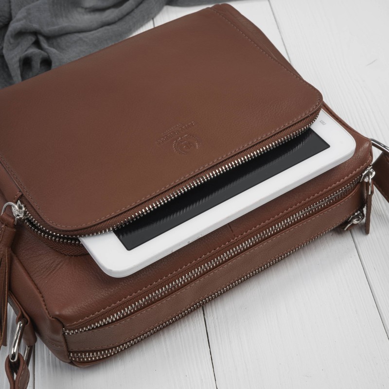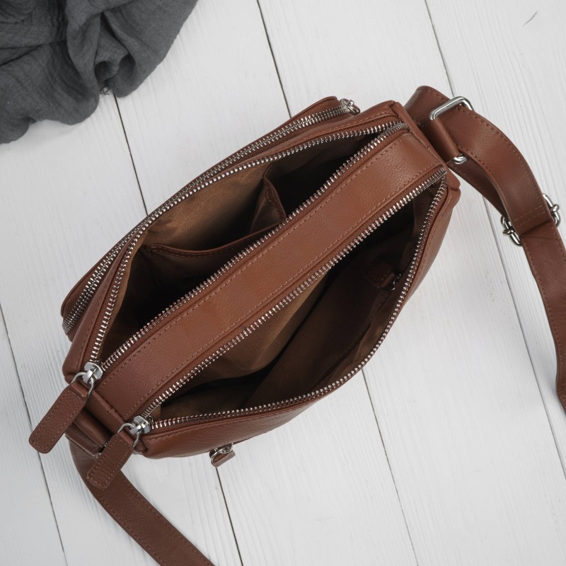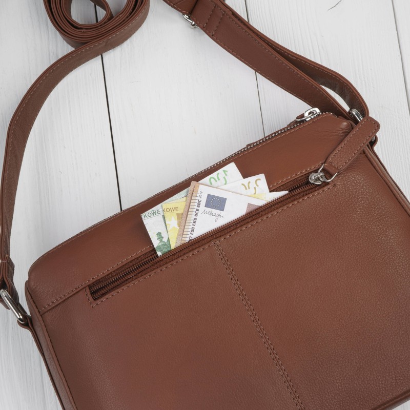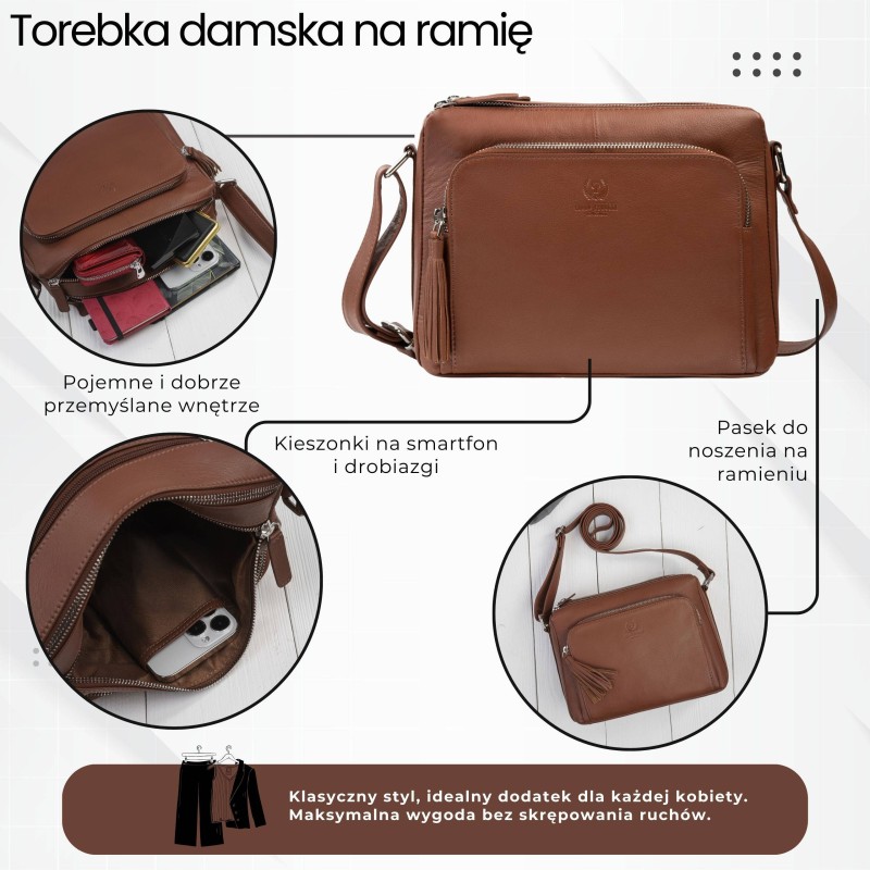 Wykonana z wysokiej jakości naturalnej skóry w szlachetnym koniakowym kolorze, który dodaje ciepła, wyrafinowania i klasy każdej stylizacji, jednocześnie podkreślając jej ponadczasowy charakter. Model ten łączy funkcjonalność z elegancją – idealny dla kobiet ceniących klasyczne dodatki z nutą nowoczesności.
