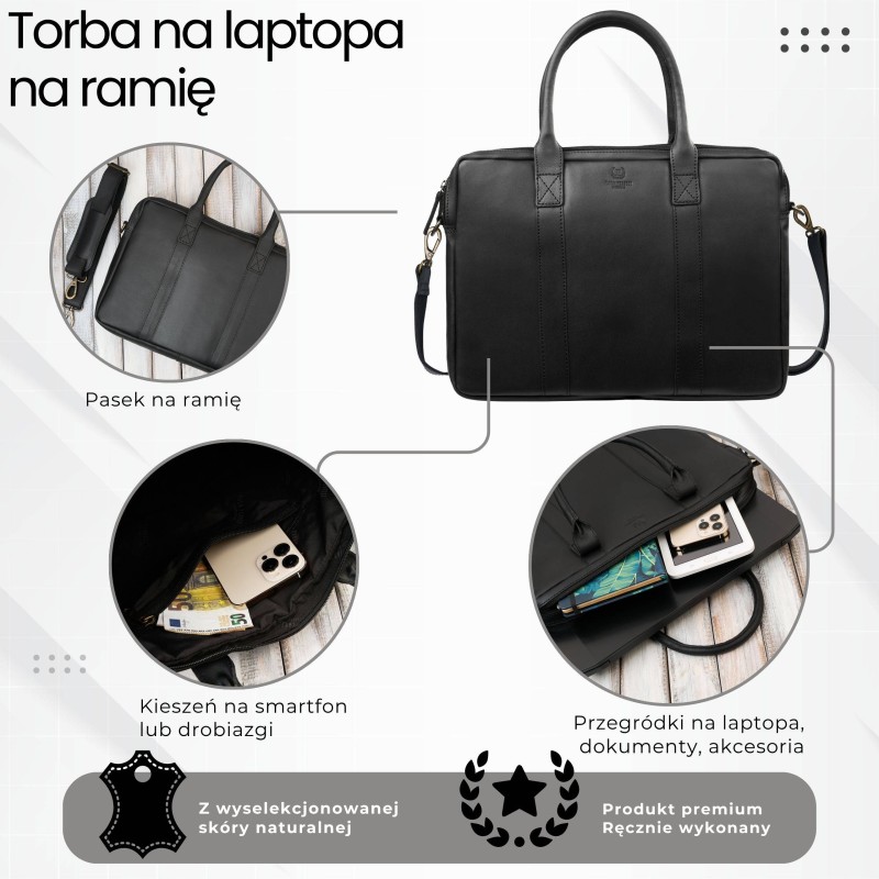 Czarna skórzana torba na laptopa to absolutny klasyk, który pasuje praktycznie do wszystkiego. Świetnie komponuje się z garderobą w odcieniach szarości, grafitu, granatu, bieli, butelkowej zieleni czy burgundu, tworząc elegancki i spójny look.
