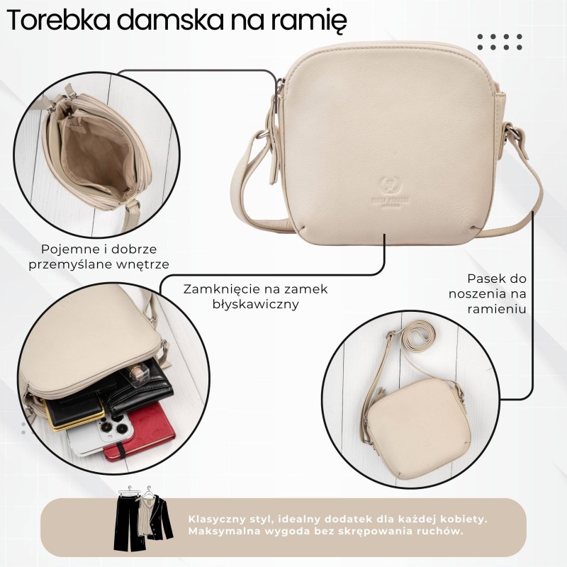 AY-25-BG to funkcjonalna, elegancka i nowoczesna torebka damska skórzana, która łączy kompaktowy format z ponadprzeciętną pojemnością.